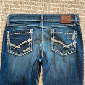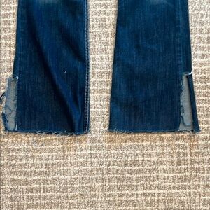 These blue flare jeans from BKE feature a classic medium to dark denim color with stylish distressing and fraying along the hem. The leg openings widen slightly from the knee down, creating a flattering silhouette that is perfect for casual wear. The hem has slits to accent a bolder flare look.