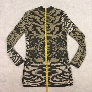 Stay cozy and stylish with this BKE Boutique women’s cardigan sweater in size XL. Designed with a bold abstract floral jacquard knit pattern in olive green, cream, and black tones, this open-front longline cardigan adds texture and warmth to any outfit. Crafted from a wool blend with mohair, it offers softness, comfort, and durability. Features ribbed trim, long sleeves, and a flattering open design perfect for layering. Ideal for casual wear, work, or evenings out.