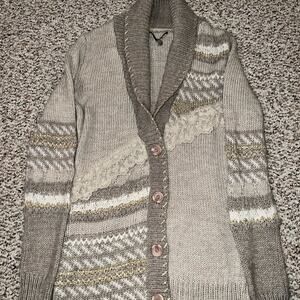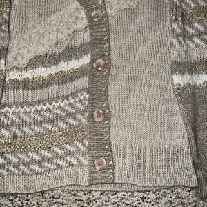 BKE Boutique Wool‎ Blend Tan Cream Metallic Gold Lace Button Cardigan Sweater