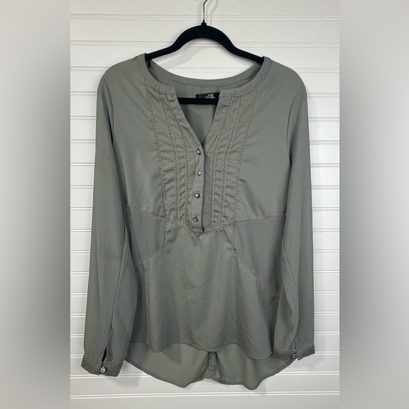 BKE Boutique women’s sage green high low long sleeve blouse. Size M. Slightly sheer. Really pretty top. Good Preloved condition.