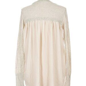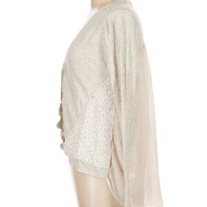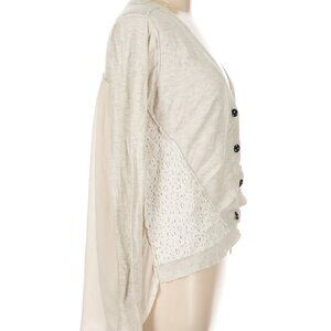 Elegant cream cardigan with lace detailing. Perfect for layering and adding a touch of sophistication to any outfit. Purchased from buckle. Absolutely stunning!! Elevate your layering game with this stylish BKE cardigan from Buckle. This piece features a flattering plunge neckline, long sleeves, and whimsical polka dot buttons down the front. The back panel has a sheer, silk-like texture that adds a delicate, feminine contrast to the cozy front. The color palette includes soft ivory and gray tones, perfect for year-round styling