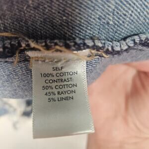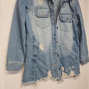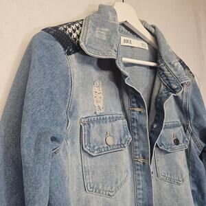 BKE Buckle Distressed Mid length Denim Jean Jacket with Patches