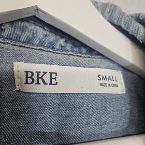 BKE Buckle Distressed Mid length Denim Jean Jacket with Patches in excellent condition.