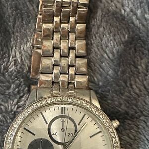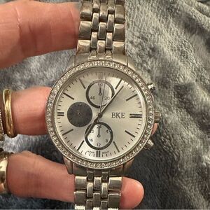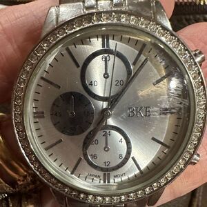Elegant BKE watch in silver with crystal accents. Features a classic round face and a metal band.