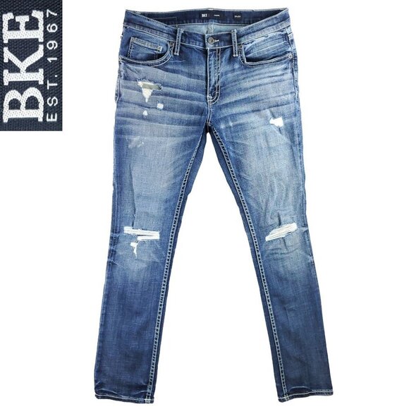 BKE Mason stretchy distressed men's denim jeans, size labeled "34x34" with actual specs of 36 waist and 35 inseam. I have included exact measurements, so you'll know if this fits you or not. Ships safely in a sealed polymailer :)