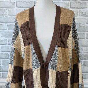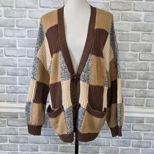 BKE Buckle Oversized Checkered Cardigan Knit Button Up L Cozy Earth Tones Casual