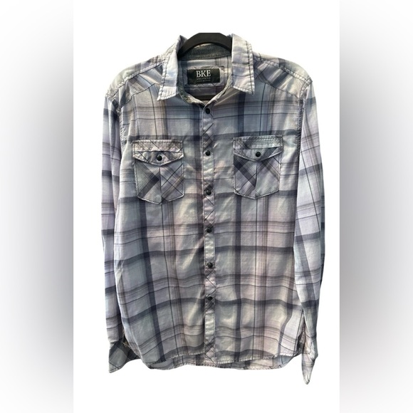 Add a touch of the Wild West to your wardrobe with this BKE Buckle Shirt in Men's Size medium . The shirt features a stylish plaid pattern in shades of lavender and gray, perfect for a casual occasion. The long sleeves and snap button closure give it a classic look, while the athletic fit and lightweight woven cotton fabric make it suitable for all seasons.