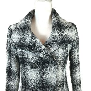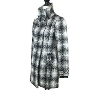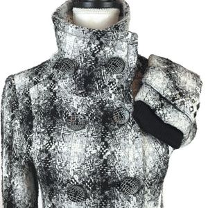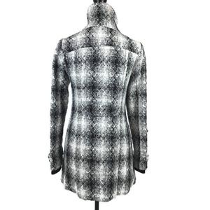 You are buying BKE Buckle Women's Coat Size Small Black/White Stud Embellished Whipstich. Very detailed. Lots o embellishments around pockets and cuffs. 47% Acrylic, 38% Polyester, 5% Wool, 5% Nylon, 5% Rayon. Lining is 100% Polyester with Polyurathane Coating. In very good pre-owned condition with no rips, stains or damage.