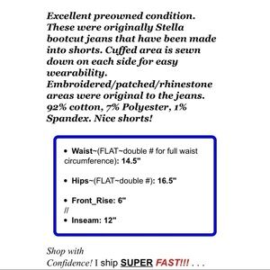 Excellent preowned condition. These were originally Stella bootcut jeans that have been made into shorts. Cuffed area is sewn down on each side for easy wearability. Embroidered/patched/rhinestone areas were original to the jeans. 92% cotton, 7% Polyester, 1% Spandex. Nice shorts!