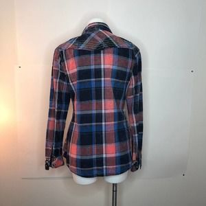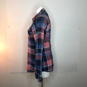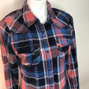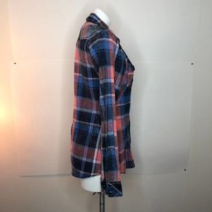 Snap up front, 2 front pockets, frayed pocket embellishment