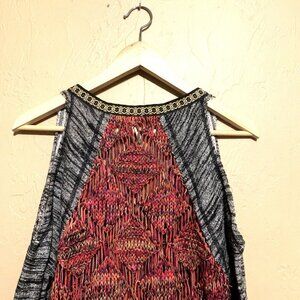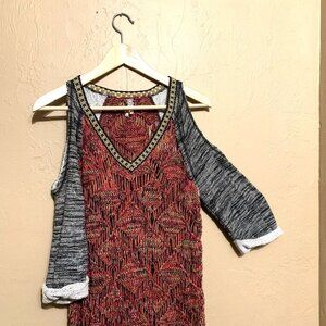 BKE Cold Shoulder Sweater Open Weave Tunic Top Buckle Multicolor Sz M Boho Hippy