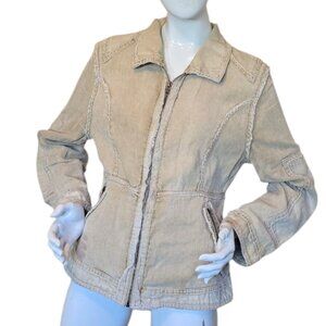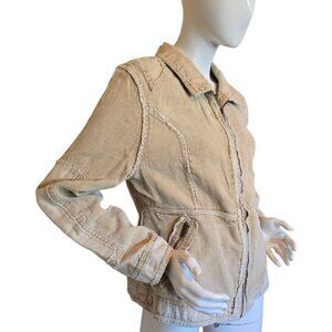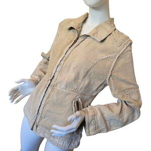 Kick your casual look up a notch with this corduroy jacket by BKE Outerwear. It features a full front zip, standard collar, a distressed look with raw seams, 2 front zip pockets, and is in a great tan color that matches everythng and is great for those cool Fall nights! It's lightweight made of ramie and cotton.Very versatile! Good pre-owned condition.