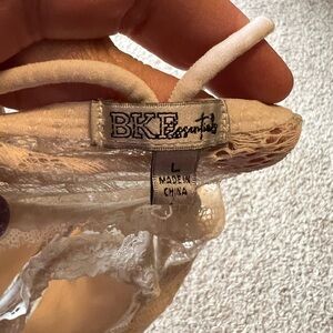 This BKE bra in a soft cream color features a comfortable wireless design with a stylish wrap front. Made from a textured fabric, it offers gentle support with wide straps and a supportive band, perfect for everyday wear.