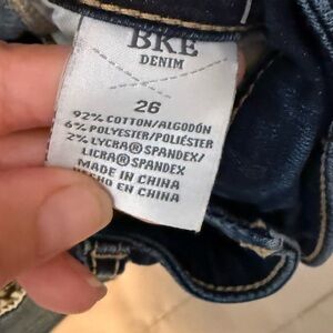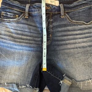 Chic dark wash jean shorts. Frayed hem adds style. Perfect for casual wear.