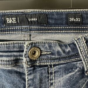 Preowned BKE Derek men’s jeans in size 36x32. These jeans feature a medium wash with slight whiskering and fading, light distressing near the front pocket, and signature thick stitched back pockets. Classic straight leg fit. Quality construction with “BKE Denim Since 1967” details on the button and leather patch.
