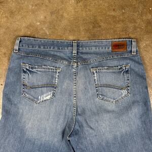 These BKE Easy Street Stretch jeans from Buckle offer classic Y2K-era styling with light fading and subtle distressing. Made in Mexico with a cotton-spandex blend for a bit of stretch, they feature a mid-rise and bootcut leg. The frayed waistband and faded tag give away their mid-2000s origins, perfect for fans of vintage denim with that early Buckle vibe.