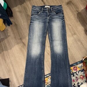 Stylish BKE jeans with a wide leg flare. Faded blue wash for a trendy look.