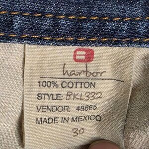BKE Harbor women’s jeans, size 30. 100% cotton midweight denim with a relaxed straight crop fit. Classic medium wash with natural fading and subtle whiskering. Features five-pocket styling, zip fly, and button closure. Made in Mexico, style BKL332. Comfortable and durable everyday denim.