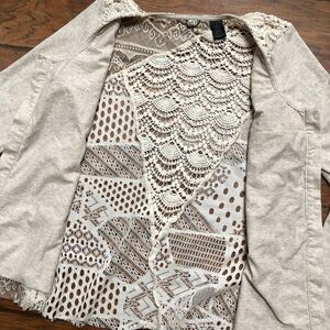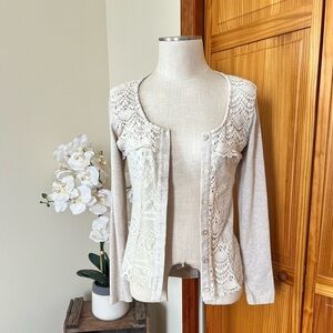 Gorgeous ivory cardigan with lace back, size small from BKE. Buttons up front, EUC.