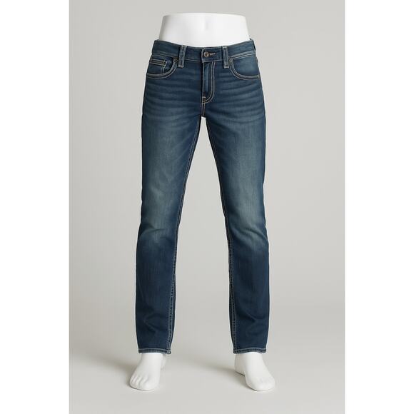 Classic BKE Jake straight-leg jeans featuring a versatile dark wash with natural fading and whiskering for a worn-in look. Made from stretch denim for all-day comfort while maintaining structure.