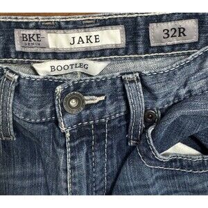 BKE Jeans Jake Mens 32x31 Blue Denim Bootcut Distressed Whiskered Thick Stitch