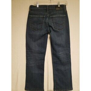 The BKE Jeans in men's size 31x32 feature a blue color with a medium wash, designed in a bootcut style with a Western cowboy theme. The denim fabric is a cotton blend with stretch for comfort, accented with button and zipper closures and distressed details. These jeans have a 5-pocket design and a mid-rise fit, suitable for everyday wear with a regular fit from the Buckle Bke product line. Ideal for those seeking a rugged yet stylish addition to their wardrobe.