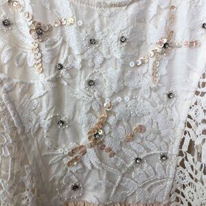 A gorgeous bib front tank top with lace, sequin, “pearl” and “diamond” details. See through lace sides and a peach pleated bottom. Rough cut bottom.