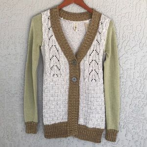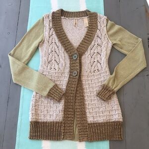 BKE, Long Sleeve, Button Down, Loose Cable Knit Cardigan Sweater. Two large front buttons. Ribbed neckline & down the front, cuff & hemline. Size small. See photos for measurements to ensure fit.