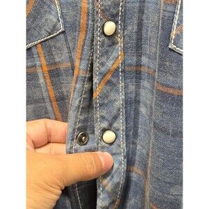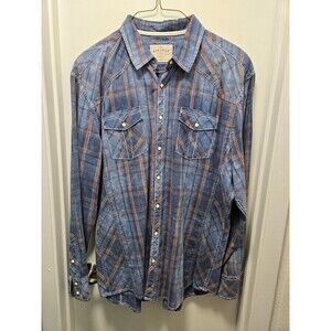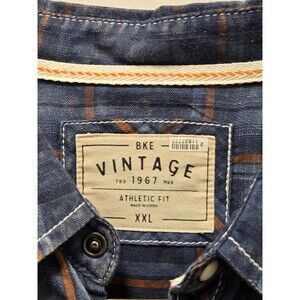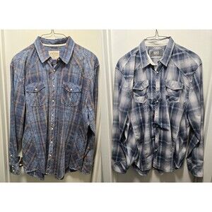 This listing is for a set of two BKE BUCKLE men's shirts in size 2XL with an athletic fit. The shirts feature a plaid pattern in a multicolor scheme with long sleeves and a button closure. Made from a cotton blend fabric, these button-up shirts are designed with pearl snap accents, ideal for a casual yet stylish look.