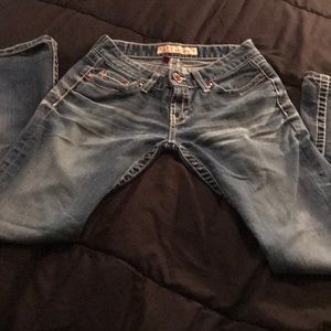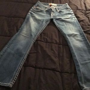 Very cute BKE Madison stretch denim jeans. Size 27x29-1/2 Used but still in good shape. Has some slight fraying on bottom of right leg- no strings, holes or anything like that. Also some of the design stitching on front pockets is gone but it looks like it’s supposed to be that way. But on the good side they give you a very cute booty! Very good & very loved jeans with lots of life left.