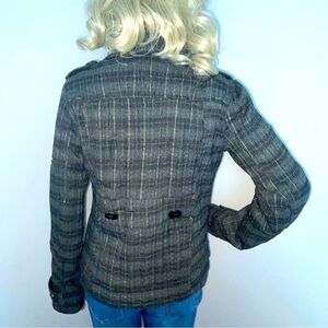 Stand out with this BKE military-style bomber jacket featuring a stylish plaid fabric, decorative straps and buttons on the sleeves and shoulders, and a bold gray and yellow color combo. Perfect for adding an edge to any outfit!