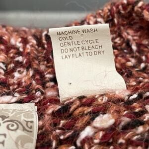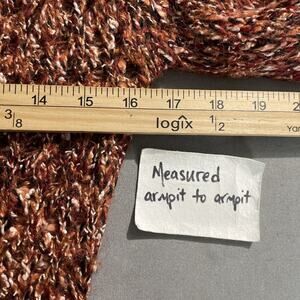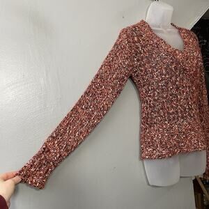 BKE long sleeve orange, burgundy, white, and black marled V-neck open knit sweater in Excellent pre-owned condition!