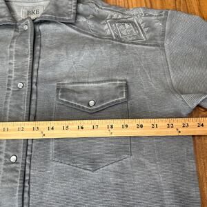 This BKE shirt for men in size M features a stylish Western design with pearl snap closures and embroidered Aztec Southwestern details. Made from a cotton blend fabric, this gray shirt has long sleeves and a spread collar, suitable for various occasions like travel, weddings, parties, casual outings, or workwear. The shirt offers a regular fit and is lightweight and breathable, making it versatile for all seasons and easy to care for. Perfect for adding a touch of Western flair to any outfit.