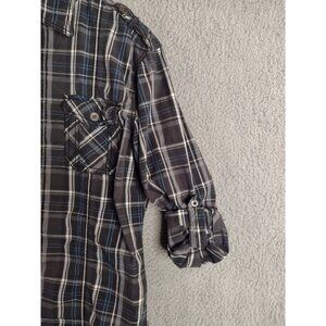 BKE Plaid Button Up Black Gray Blue Long Roll Up Sleeve Shirt Men's Size Large