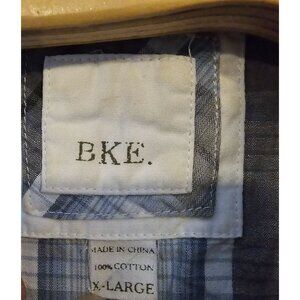 This BKE slim fit pearl snap button up shirt in XL size features a classic grey and blue plaid. Its long sleeves and western style make it a versatile wardrobe staple.