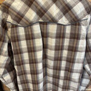 This plaid Western-style shirt features a standard fit with snap buttons, dual chest pockets, and a classic long-sleeve design for versatile wear.