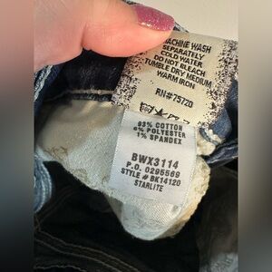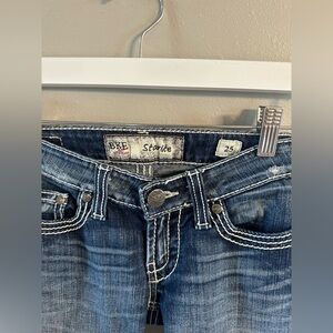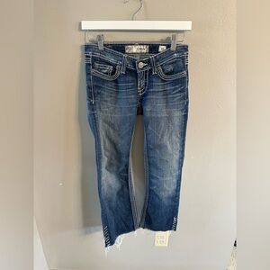 Chic BKE cropped jeans. Deep blue denim with white detailing. Frayed hem adds style.