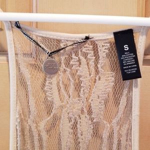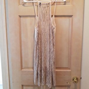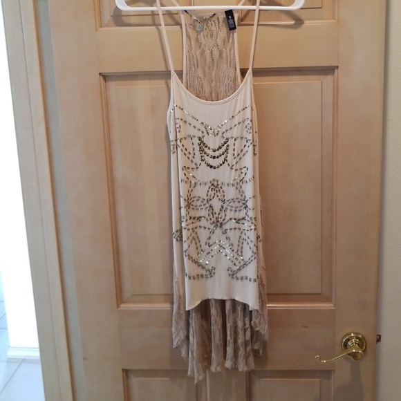 Tan high-low cover-up. Beaded and sequined front with open lace back. Never worn.