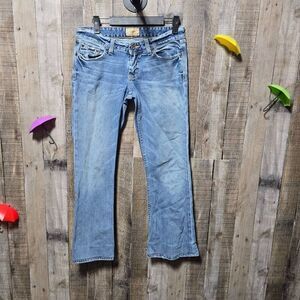 Details: low Rise, bootcut, light medium wash, little stretch, zip and button closure