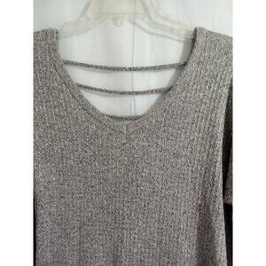 BKE women's (juniors) gray long sleeve v neck pullover with criss-cross design on the back. This blouse is made of 74% rayon 24% polyester 2% spandex and is machine washable. This is a pre-owned item in good used condition no notable damage or stains. All measurements are done with item laying flat.