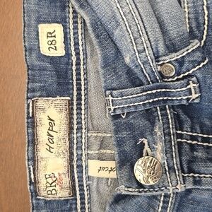 These BKE jeans in a classic blue hue feature a stylish distressed look, perfect for a casual day out. The denim offers a comfortable fit with a hint of stretch, ensuring ease of movement. The subtle fading and whiskering add a touch of character to these versatile jeans.