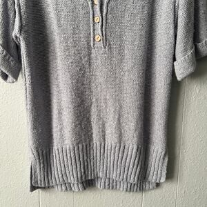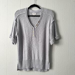 BKE women's pullover knit sweater in gray. 1/4 button v-neck. Drop shoulders. Short folded sleeves. Reverse seams. Ribbed bottom hem. Side slits. In good used condition. No stains, tears or holes.