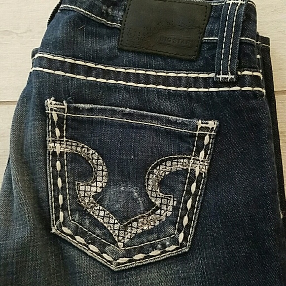 Dark blue jeans minimum wear. Silver stitching in good shape. Long length. Not straight boot cut but not big flare