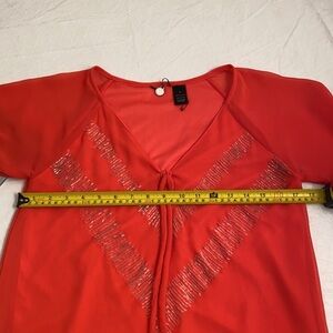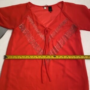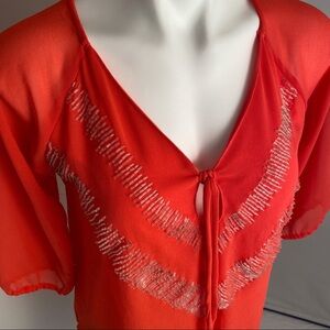 BKE coral beaded layered three quarter sleeve v-neck blouse. Keyhole front when tied. Stretch layer underneath a flowy semi sheer overlay. NWOT. Smoke free home