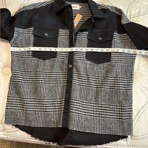 Stylish BKE jacket with plaid design. Features button closure and chest pockets. Perfect for layering. Size medium. Smoke free home. New with tags
