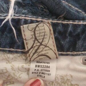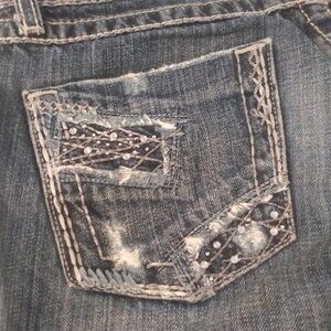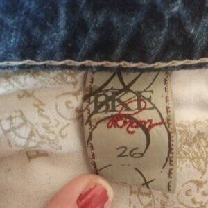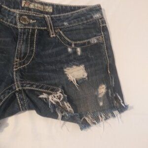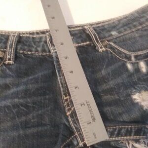 BKE women's size 26 dark wash denim shorts, distressed, cut-off, very short, intentionally cut on the sides there are other parts of the shorts that were torn accidently or intentionally, please look closely at pictures