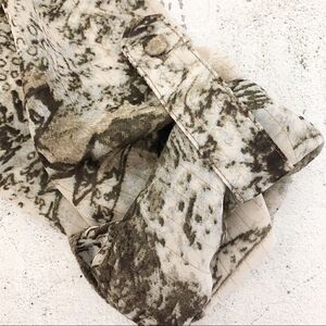 This BKE Boutique top has semi- sheer material with a v-neck, roll-tab sleeves, button down front with patch pockets on the chest and the hem is Slightly longer in the back.