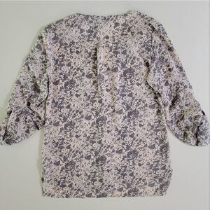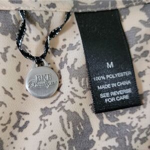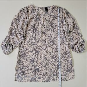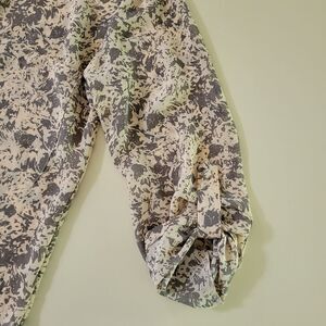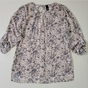 Boast an ultrafeminine vibe in this pretty abstract print blouse by BKE with sleeves styled to be neatly folded up and tabbed at the elbow or worn long. With a v-neckline and a button-down front, this top is an easy fit cut with a drop-tail hem. Perfect for work or dress up your denims! NWOT.