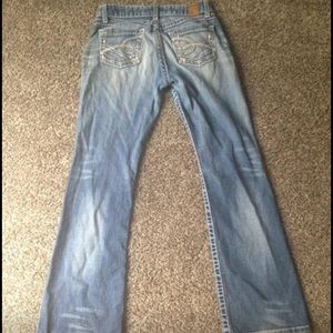 Woman's size 28, has a hole across one leg above the knee, and wear at bottom of the jeans. Doesn't affect the look.