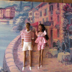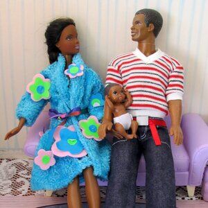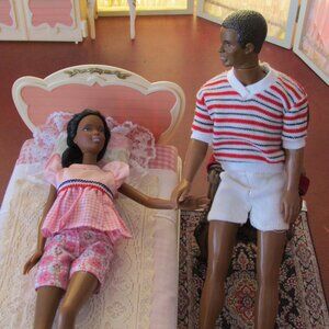 This story begins with a lovely, pregnant African American Barbie and her husband, Ken, as they spend time walking together before the baby arrives. You'll see the sweet Barbie label robe she wears in the hospital, the soft baby bunting/carrier, and the dress she wears afterward. All the clothes these dolls are wearing are included, but not the background props or furniture. Ken is marked 1987 and she is 1990 on the back of her head. Her black hair has subtle streaks.